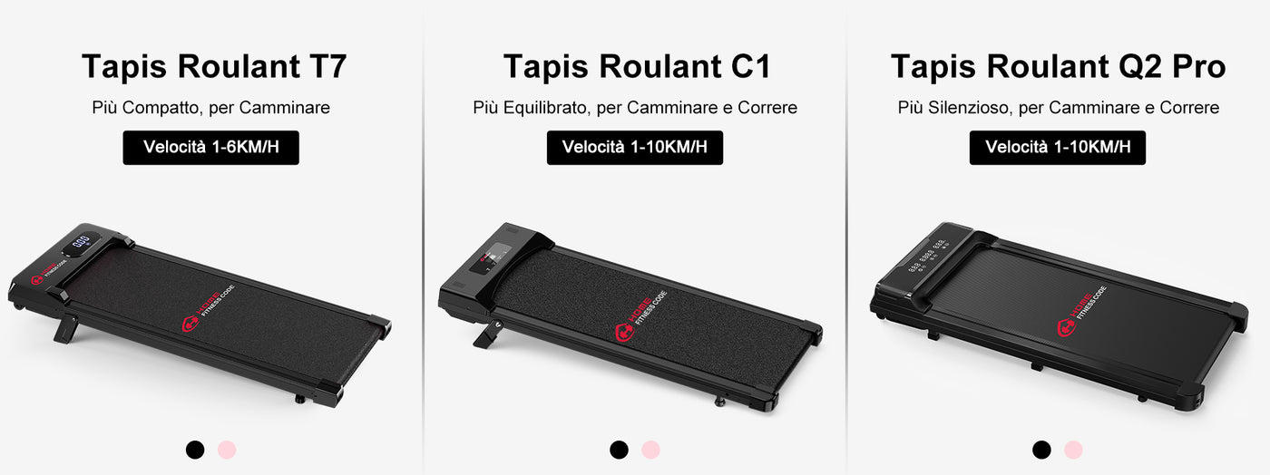 | Titolo | Tapis Roulant T7, Velocità 1-6KM/H, 5% Inclinazione Manuale | Tapis Roulant C1, Velocità 1-10KM/H, 5% Inclinazione Manuale | Tapis Roulant Q2 Pro, Velocità 1-10KM/H | Tapis Roulant Y1 con Inclinazione Automatica 0-12%, Velocità 1-10KM/H |