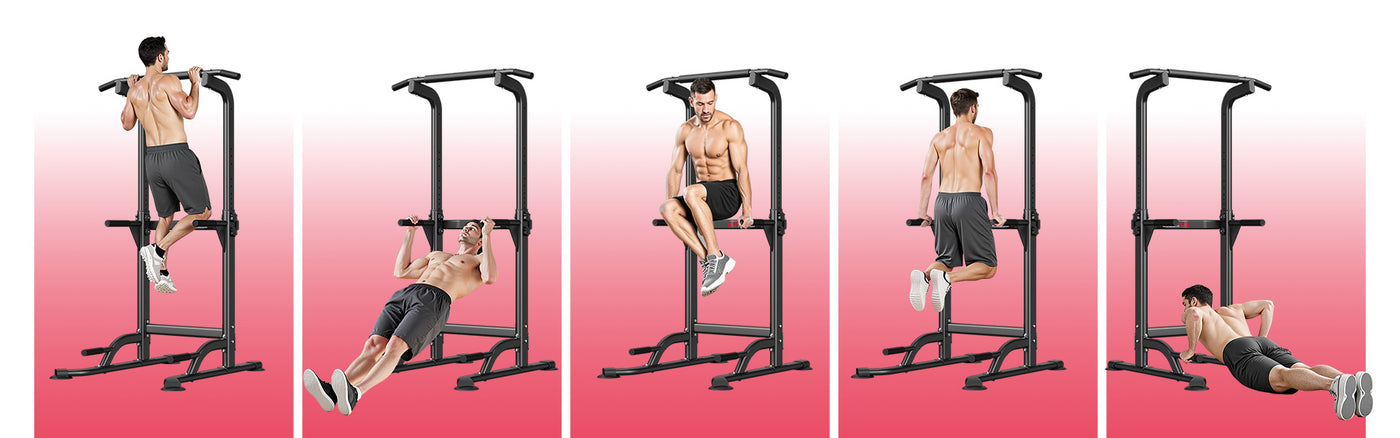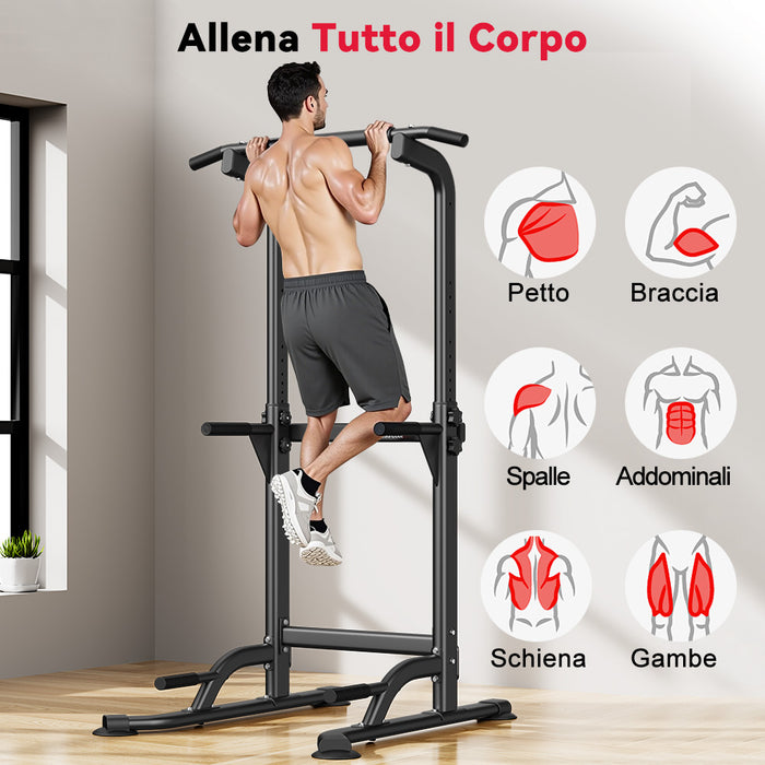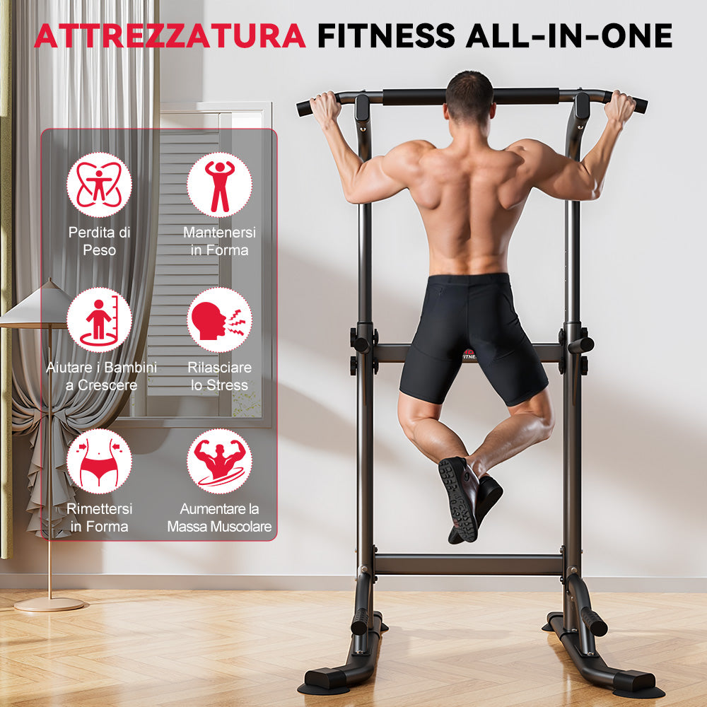 Con questa stazione dip power tower puoi eseguire trazioni, flessioni, dip, allenare braccia, schiena, addominali o gambe.